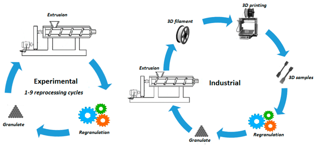 Събиране и сортиране на филамента по вид и цвят. Трябва да се използват само филаменти от един и същи вид пластмаса, за да се избегнат несъвместимости при топенето. Почистване на филамента от замърсявания, като прах, мазнина или остатъци от други материали. Това може да се направи с вода, сапун и четка. Рязане на филамента на малки парчета или ленти. Това може да се направи с ножица, резачка или специална машини. Сушене на парчетата филамент във фурна или на слънце. Това е важно, за да се премахне влагата, която може да повлияе на качеството на филамент. Топене на парчетата филамент в специален екструдер, който ги превръща в топла и текуча смес. Изтегляне на сместа през дюза, която формира тънък и дълъг филамент. Филаментът трябва да има определен диаметър, например 1,75 мм или 2,85 мм, в зависимост от 3D принтера. Охлаждане на филаментът във водна баня или въздушен поток. Това е необходимо, за да се запази формата и твърдостта на филамента. Навиване на филаментът на ролка или шпула. Това улеснява съхранението и транспортирането на филамента.
